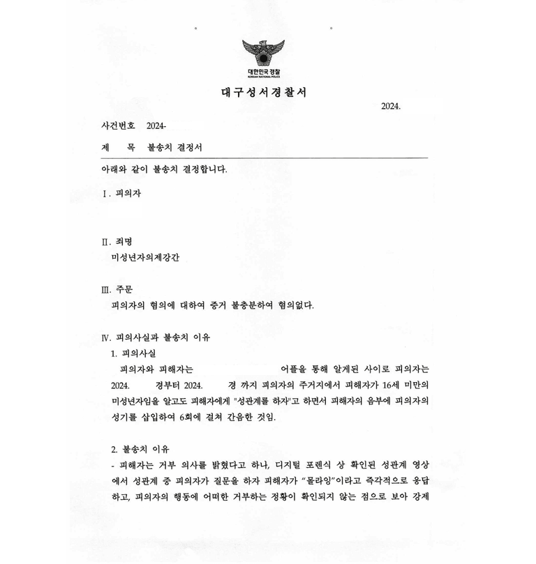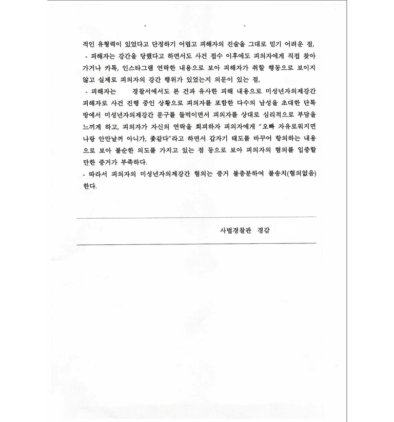 저는 피의자 조사부터 동석하여 이 사건의 경위, 당사자 관계, 나이, 행위태양, 성관계 이후 정황 등을 중점적으로 주장 입증하였고 경찰은 무혐의 불송치결정을 하였습니다.