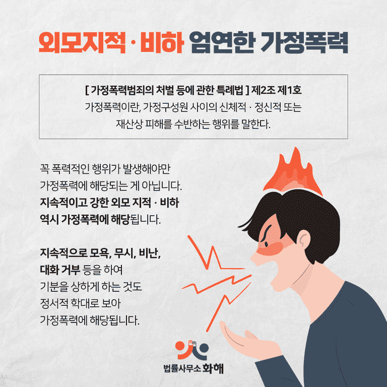 가정폭력은 신체적 피해 외에도 정신적 · 재산상 피해를 수반하는 행위까지 포함하기에 지속적으로 배우자 또는 직계가족에게 모욕, 무시, 비난, 의사결정 침해, 대화 거부 등을 하여 기분을 상하게 하는 것도 정서적 학대로 보아 가정폭력에 해당됩니다. 즉, 지속적이고 심한 외모 지적 역시 언어폭력을 동반하는 정서적 학대가 될 수 있습니다.