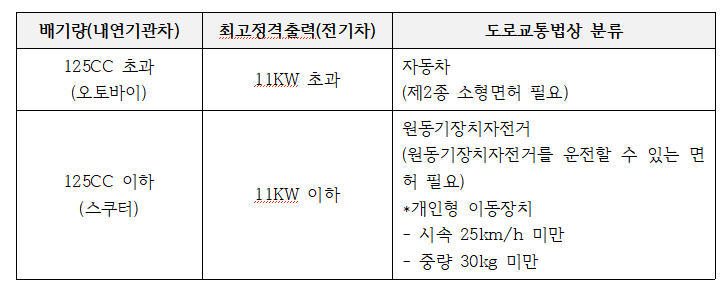 첫째, 전동퀵보드는 통상 이륜차와 구별되는 별개의 존재(퀵보드)로 인식되나 도로교통법상 원동기장치자전거에 해당한다는 점입니다. 특히 1) 시속 25킬로미터 이상으로 운행할 경우 전동기가 작동하지 아니하고 차체 중량이 30킬로그램 미만인 2) 전동킥보드, 전동이륜평행차. 전동기의 동력만으로 움직일 수 있는 자전거를 특히 ‘개인형 이동장치’라고 하고 있습니다. 원동기장치자전거 내에서 개인형 이동장치는 별도의 규율이 필요할 수 있기 때문입니다.