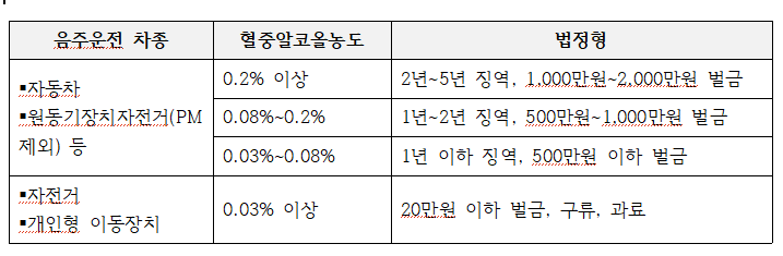 자동차 및 원동기장치자전거(PM 포함) 그리고 자전거 운전자까지 음주운전은 금지됩니다. 이러한 음주운전은 혈중알코올농도 0.03%를 말하며, 이를 위반한 경우 혈중알코올농도 수치에 따라 다르게 처벌하고 있습니다. 다만, 자전거나 개인형 이동장치의 경우 음주운전으로 인한 위험성이 낮다고 보고 혈중알코올농도와 관계없이 일률적으로 가볍게 처벌하도록 하고 있습니다. 음주측정거부를 처벌하는 것도 동일하나, 재범으로 인한 가중처벌 규정(제48조의2 제1항)은 적용되지 않는 것으로 하고 있습니다. 범칙행위의 처리 특례가 적용됨은 무면허운전과 같습니다. 참고로, 아직도 자전거 음주운전은 처벌되지 않는다고 잘못 알고 있는 사람들이 있는데, 2018년 개정으로 처벌 대상이 되었고, 2020년 개정으로 개인형 이동장치를 자전거와 같은 수준으로 처벌하도록 하였습니다.
