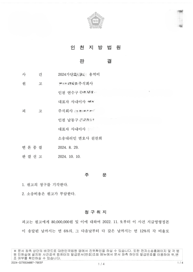 결국, 재판부는 원고가 청구원인을 입증하지 못했다면서 원고 청구를 모두 기각하였습니다. 자칫 허위 증언으로 피고가 약속하지도 않은 용역비를 책임질 수도 있는 사건을 완벽한 대비로 잘 방어한 사례였습니다.