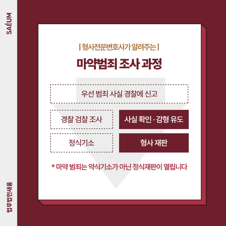 대부분 마약범죄는 약식기소가 아닌 정식기소가 열리게 되며, 재판을 받게 됩니다. 이때, 조사 과정에서 진술한 부분들과 당시의 언행 등이 양형에 영향을 주게 됩니다. 그렇기에 조사를 받을 때 신중하게 대응해야 하는데요.
