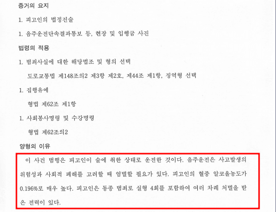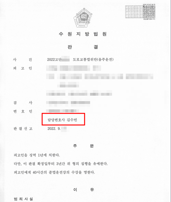 의뢰인은 음주운전 5회, 동종 전과로 이미 실형을 받은 점, 혈중알코올농도가 0.196%인 점 등 매우 불리한 사정에 있었으나 변호인의 조력을 통해 집행유예의 선처를 다시 받게 되었습니다.