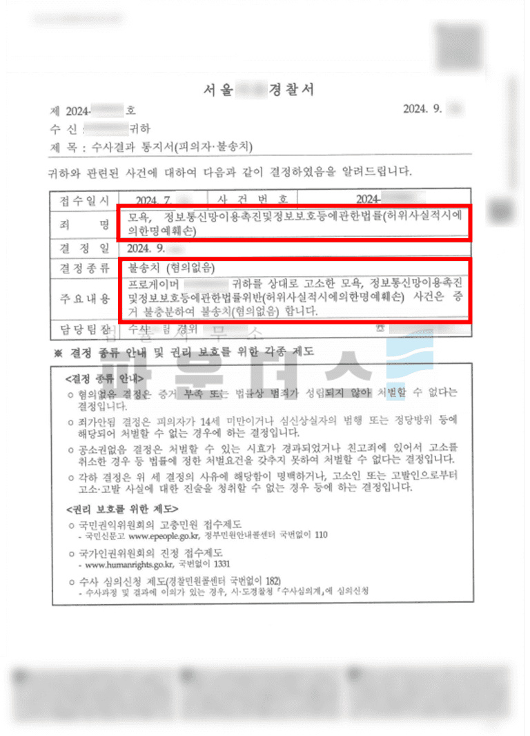 이후 변호인은 변호인 의견서 작성을 통해 진술 내용을 다시 한번 전달하며 무혐의를 주장하였고 그 결과 게임 커뮤니티에 고소인을 향한 명예훼손 사건에 있어 불송치(혐의없음) 결정으로 마무리 지을 수 있었습니다.