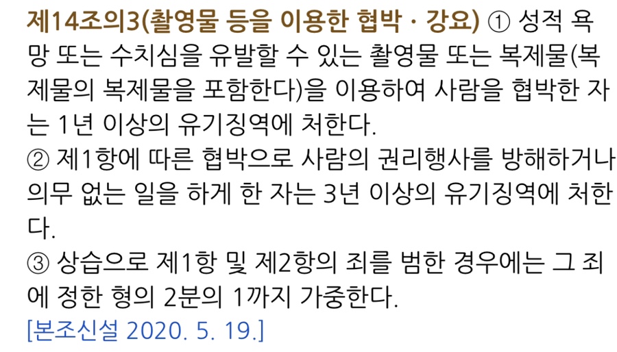 '성폭력범죄의 처벌 등에 관한 특례법'은 성적 욕망 또는 수치심을 유발할 수 있는 촬영물 또는 복제물(복제물의 복제물을 포함한다)을 이용하여 사람을 협박한 경우 1년 이상의 유기징역에 처하도록 규정하고 있습니다.