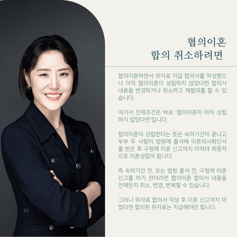 즉 숙려기간 전, 또는 법원 출석 전, 구청에 이혼 신고를 하기 전이라면 협의이혼 합의서 내용을 언제든지 취소, 변경, 번복할 수 있습니다.
