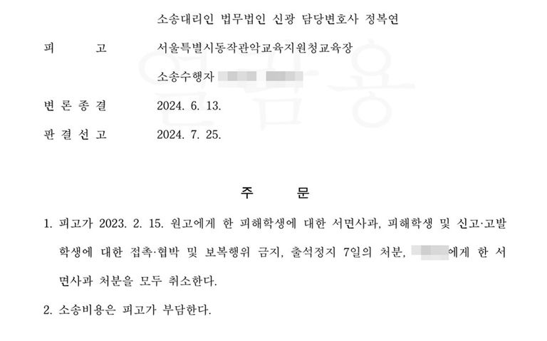 소송 끝에 법원은 ㅂ군의 가해자로서의 조치를 취소했습니다.