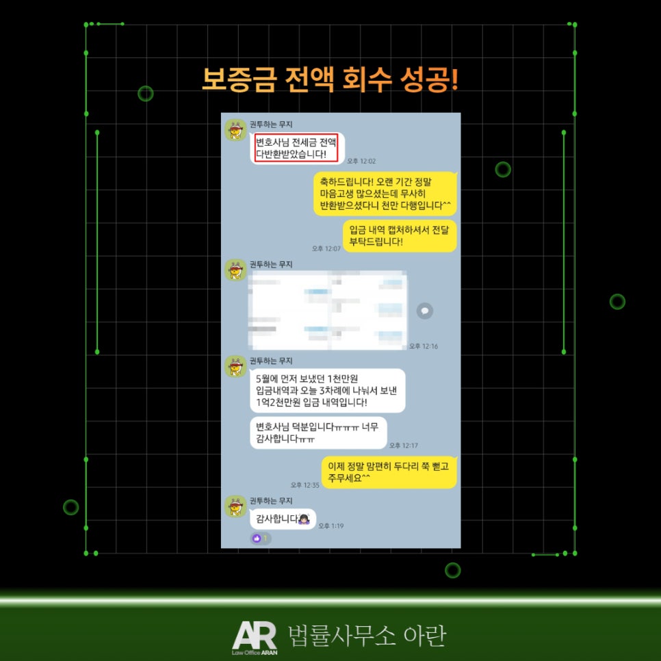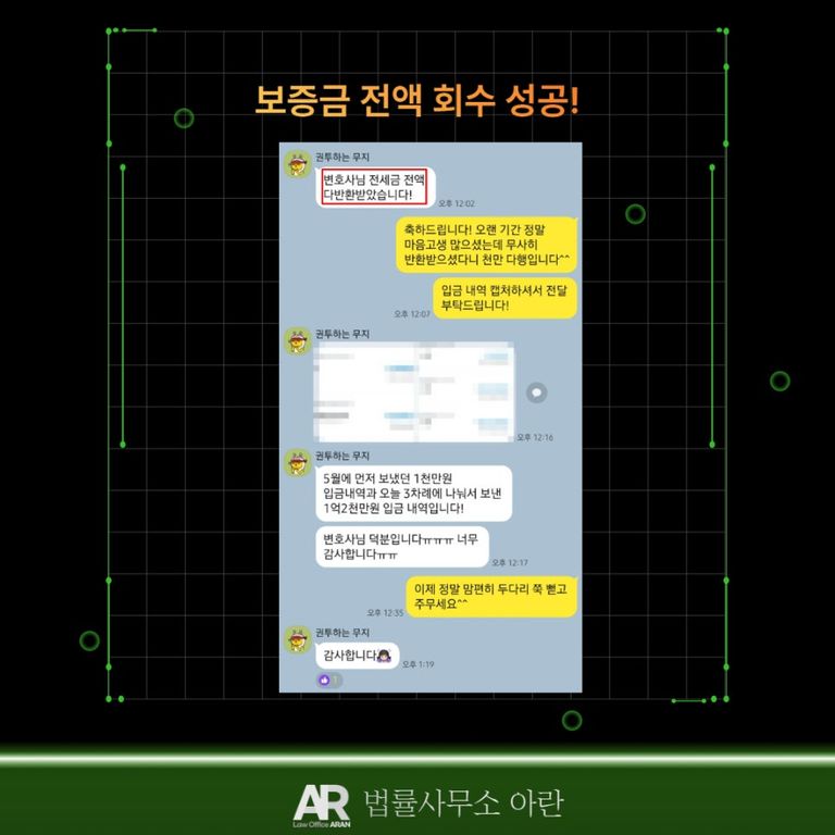 그리고 마침내 소제기 시점으로부터 4개월 뒤, 의뢰인은 기존 집주인으로부터 보증금 전액을 반환받을 수 있었습니다.