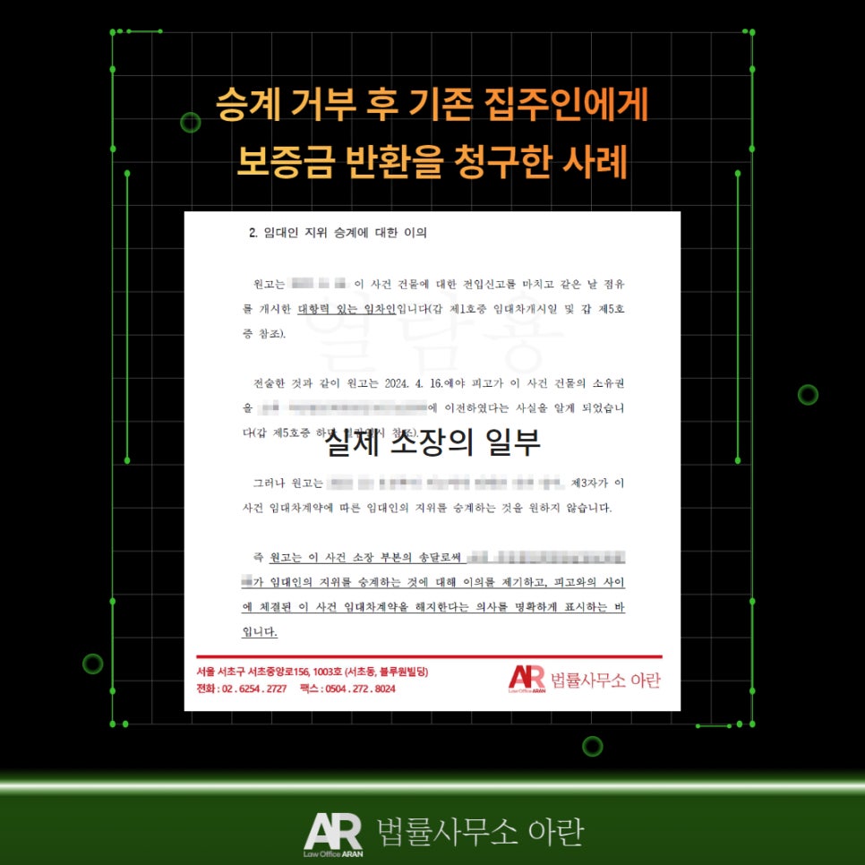 이에 의뢰인은 '집주인이 바뀌면 계약을 해지하겠다. 임대인 지위 승계를 거부한다'라고 명확하게 의사를 밝혔습니다.