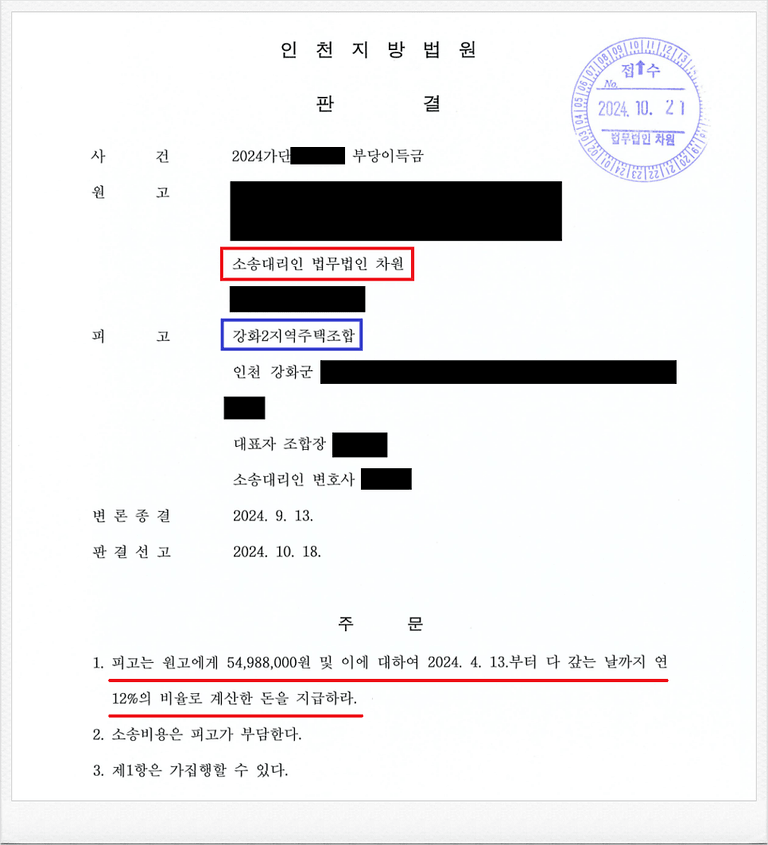 그러나, 피고 강화2지역주택조합 측의 사업이 계획대로 진행되지 않았고, 이에 의뢰인은 정식 민사소송을 통하여 기 납입한 금원의 반환을 원하셨습니다.