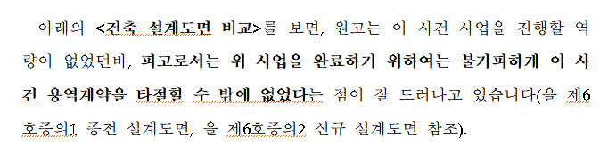 저는 이 사건 PM 용역계약이 해지된 근본적인 원인은 A가 아니라 B의 전문성 결여로 인한 것이며, 이를 입증하기 위하여 B가 건축 설계도면에 대한 기본적인 이해도 없었다는 점을 서면에 상세히 기재하였고, 재판부를 적극적으로 설득하였습니다.