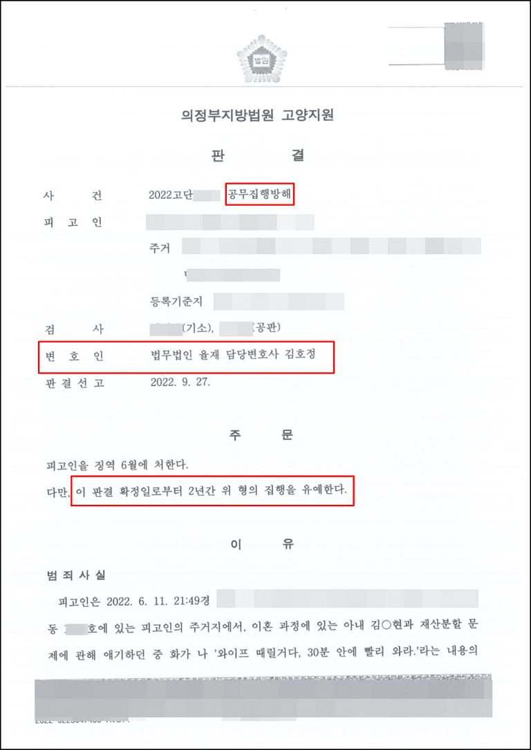 본 사건 의뢰인께선 아내와 이혼 과정 중 재산분할에 대한 다툼으로 인해 아내의 112 신고로 출동한 경찰관들을 수차례 밀치고 폭행한 혐의로 정식 기소되었습니다.