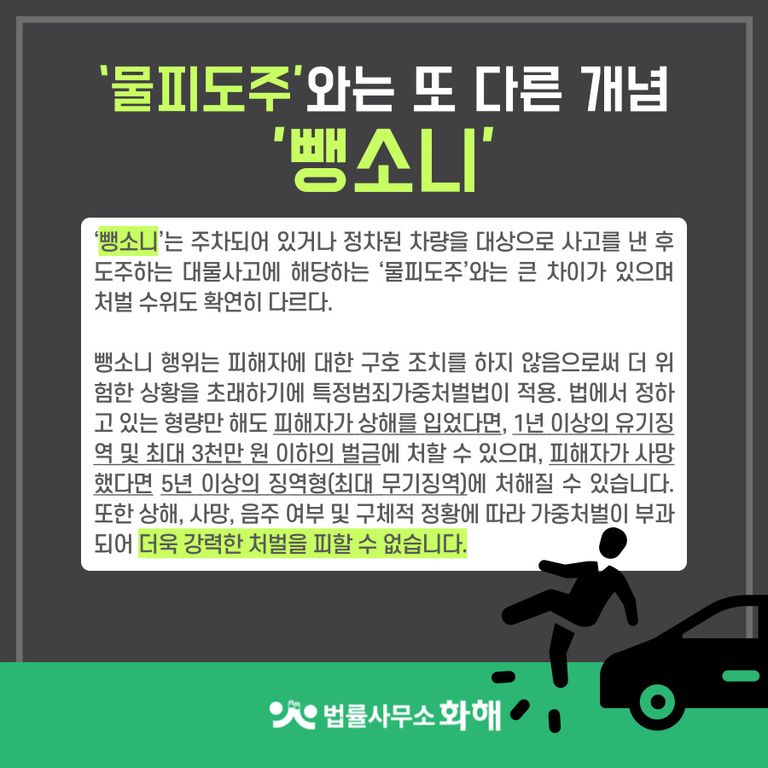 ‘뺑소니’는 주차되어 있거나 정차된 차량을 대상으로 사고를 낸 후 도주하는 대물사고에 해당하는 ‘물피도주’와는 큰 차이가 있으며 처벌 수위도 확연히 다른데요.