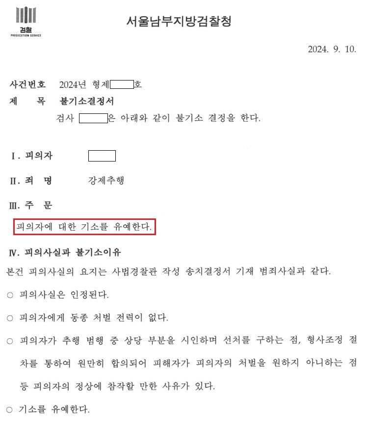 이 사건 담당 검사는 변호인의 의견을 받아들이고, '피해자와 합의한 점, 피의자가 추행 범행 중 상당 부분을 시인하며 선처를 구하는 점 등 피의자의 정상에 참작할 만한 사유가 있다'는 판단으로 의뢰인분께 기소유예 처분을 하였습니다.