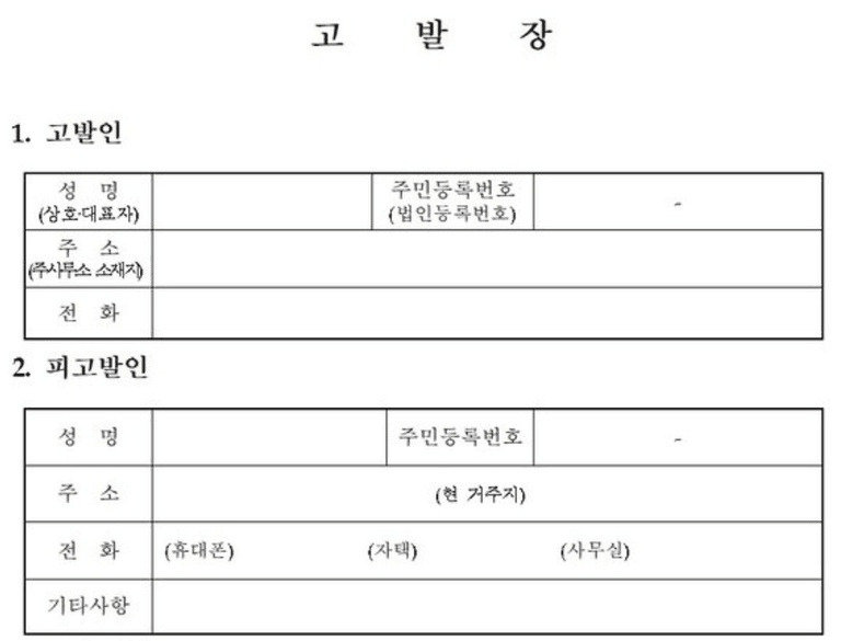 아래 그림은 흔히 구할 수 있는 고발장의 서식으로, 이 사건의 피고인은 피고발인 항목에 '성명, 주소, 주민등록번호' 등 구체적인 인적사항을 기재한 것으로 보입니다. 피고인 측은 공익적인 목적에 의한 행위로 형법 제20조의 정당행위에 해당한다고 주장하였지만, 1심 재판부에서는 이를 받아들이지 않았니다.