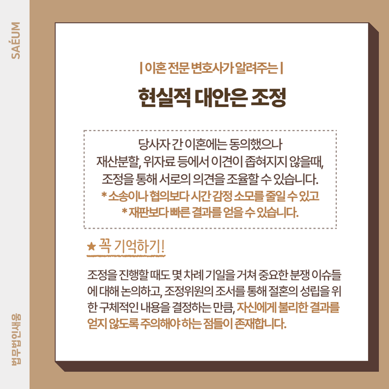이러한 점을 고려할 때 현실적으로 효율성이 높은 대안이 바로 조정입니다. 조정절차란, 절혼의 큰 틀에는 동의하였으나 재산의 배분, 위자료의 액수 등으로 인해 서로 이견이 좁혀지지 않을 때 조율하는 과정을 의미합니다.