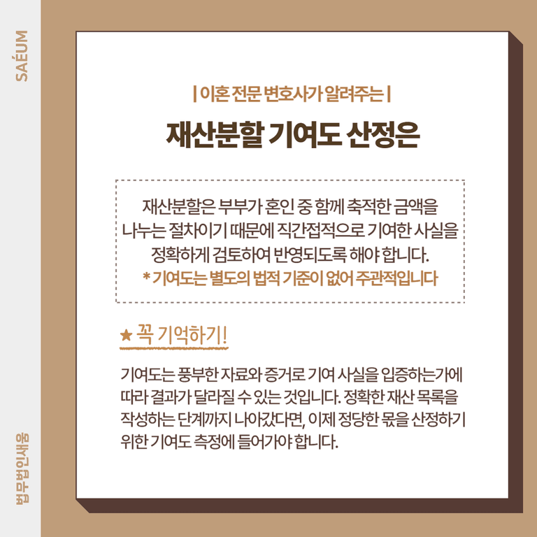 참고로 기여도는 별도의 법적 기준이 없으며 매우 주관적입니다. 얼마만큼 풍부한 자료와 증거로 자신이 기여한 사실을 입증하는가에 따라 결과가 달라질 수 있는 것입니다. 따라서 재산은닉의 우려를 막고 정확한 목록을 작성한 단계까지 나아갔다면, 이후에는 나의 정당한 몫을 산정하기 위한 기여도 측정에 들어가야 합니다.