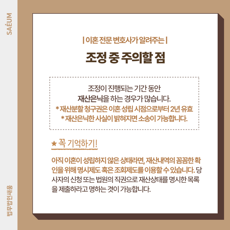 따라서 조정을 고려하고 있다면 위와 같은 실수를 저지르지 않도록 해야 합니다. 반대로 상대 배우자의 재산은닉이 염려된다면, 사전에 변호사의 도움을 받아 적절한 제도를 통해 명확하게 확인한 후 분할에 들어가는 것이 필요합니다.
