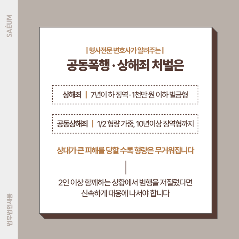 일반적인 폭행이나 상해보다 공동상해죄 공동폭행의 처벌이 심한 것을 볼 수 있습니다.