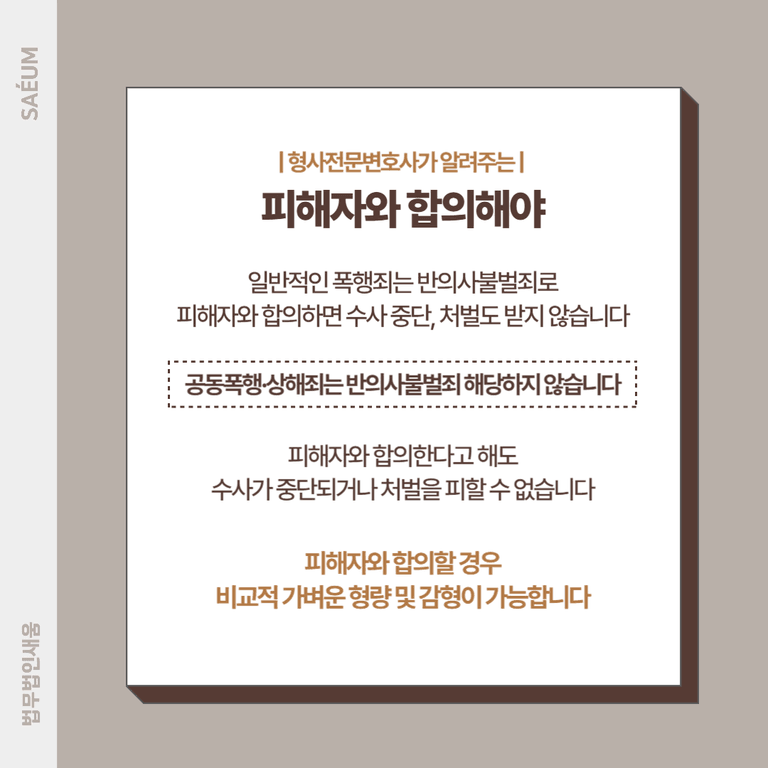 하지만 공동폭행이나 공동상해죄 같은 경우 반의사불벌죄에 해당하지 않기 때문에 설령 합의한다고 해도 그대로 사건이 중단되거나 하지는 않습니다.
