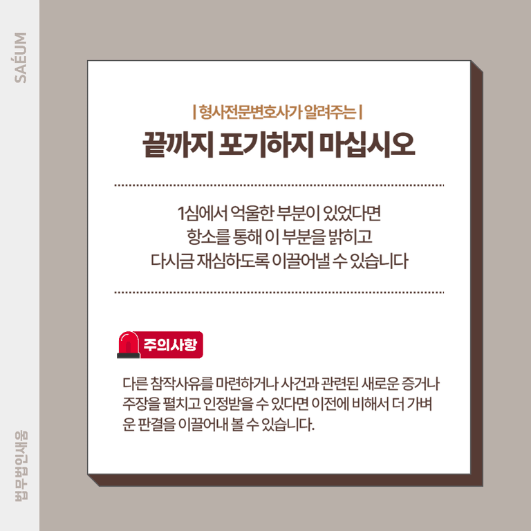 이전에는 적용되지 않았던 다른 참작사유를 마련하거나 사건과 관련된 새로운 증거나 주장을 펼치고 인정받을 수 있다면 이전에 비해서 더 가벼운 판결을 이끌어내 볼 수 있으니 원치 않는 결과가 나왔다고 해서 포기할 것이 아니라 끝까지 대응하여 긍정적인 경과를 이끌어낼 수 있도록 해야 합니다.