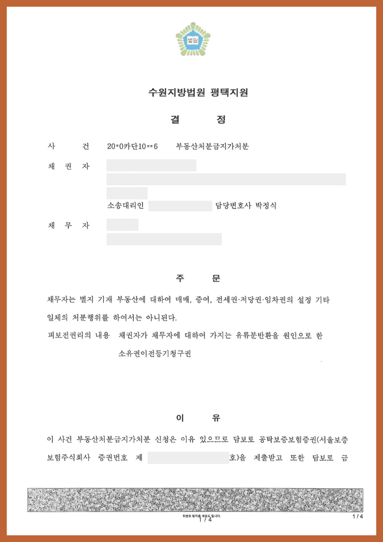 상속인들은 손자(조카)가 증여받은 부동산이 사실은 그 조카의 부모인 다른 상속인이 실질적으로 받은 것과 다름없다고 생각하고, 실제 다른 형제가 몰래 한 것이라고 의심하게 되었습니다. 서로 합의가 되지 않아서 상속인들인 채권자는 다른 형제를 상대로 우선 조카가 증여받은 부동산이 다른 곳에 처분되거나 담보로 제공되지 않도록 긴급히 처분금지가처분을 하게 되었습니다.