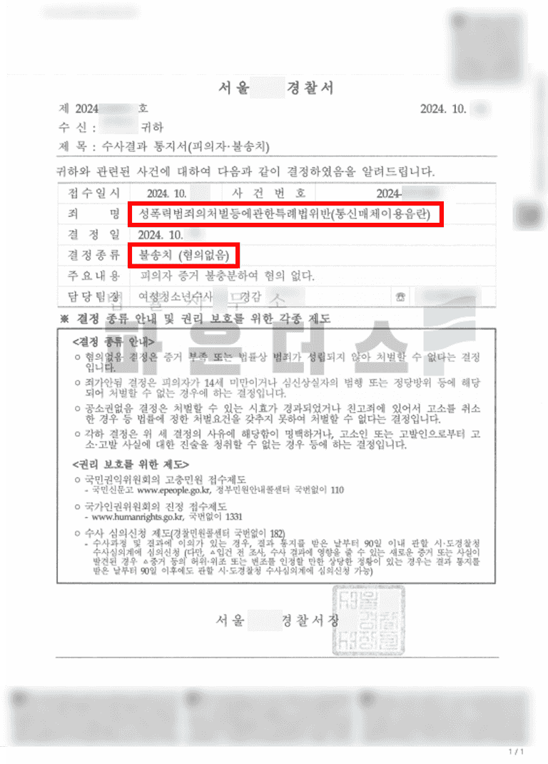 그 결과 의뢰인은 상대 여성에게 “만나서 밥 먹고 떡치자고.. 너 맛있어서 하자는거지”라 전송한 카톡 통매음 사건에 있어 불송치 결정(혐의없음)의 결과로 경찰 단계에서 사건을 마무리지을 수 있었습니다.