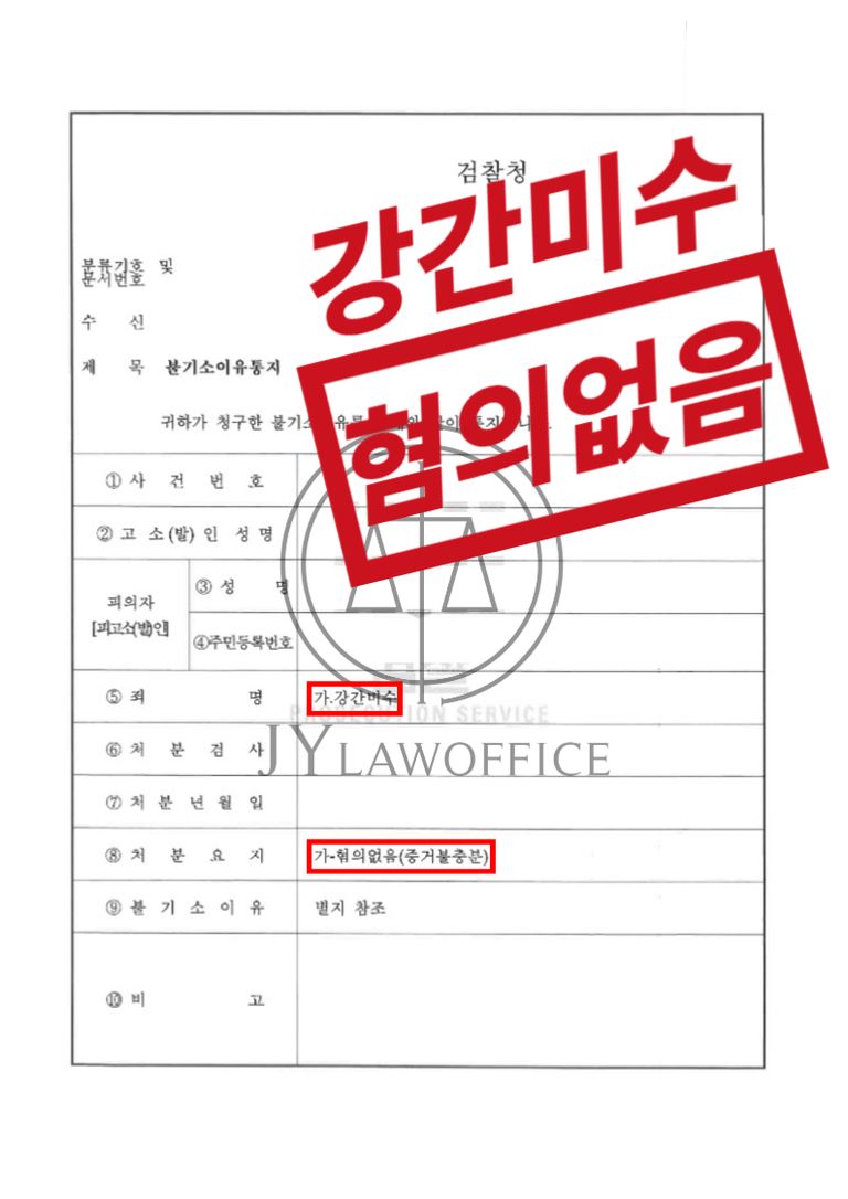 이와 같은 변호인의 조력에 따라, 의뢰인은 강간미수 혐의에 대하여 '혐의없음' 처분을 받고 사건을 무사히 종결시킬 수 있었습니다.