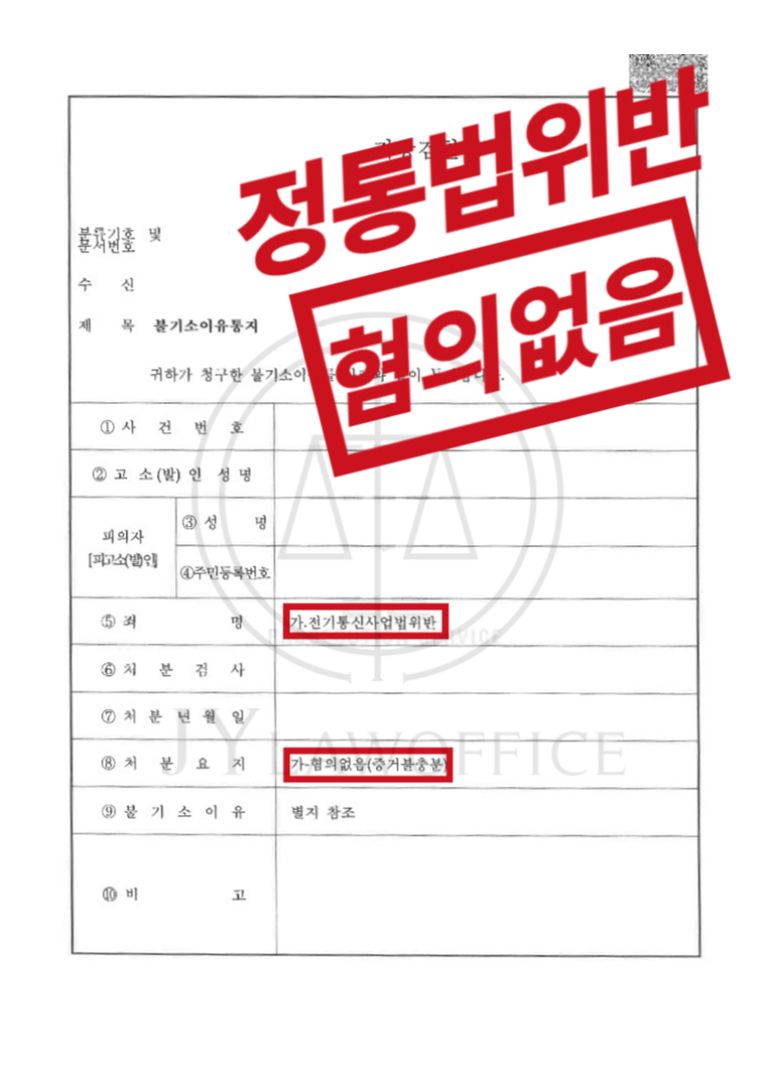 본 사건의 의뢰인은 금융거래 관련 문제로 성명불상자에게 자신의 개인정보를 전달하였는데, 이 과정에서 전기통신사업법위반의 혐의를 받게 되었고, 이를 바로잡기 위해 본 JY법률사무소를 찾아 주셨습니다.
