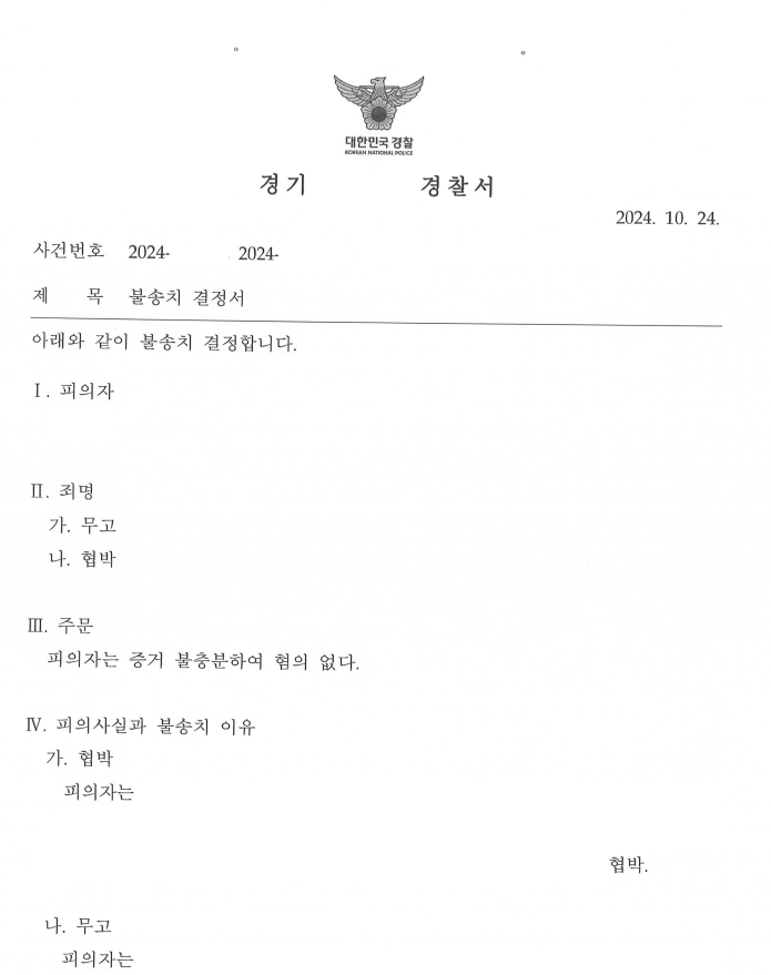 최종적으로 불송치(혐의없음)결정을 받을 수 있었습니다.