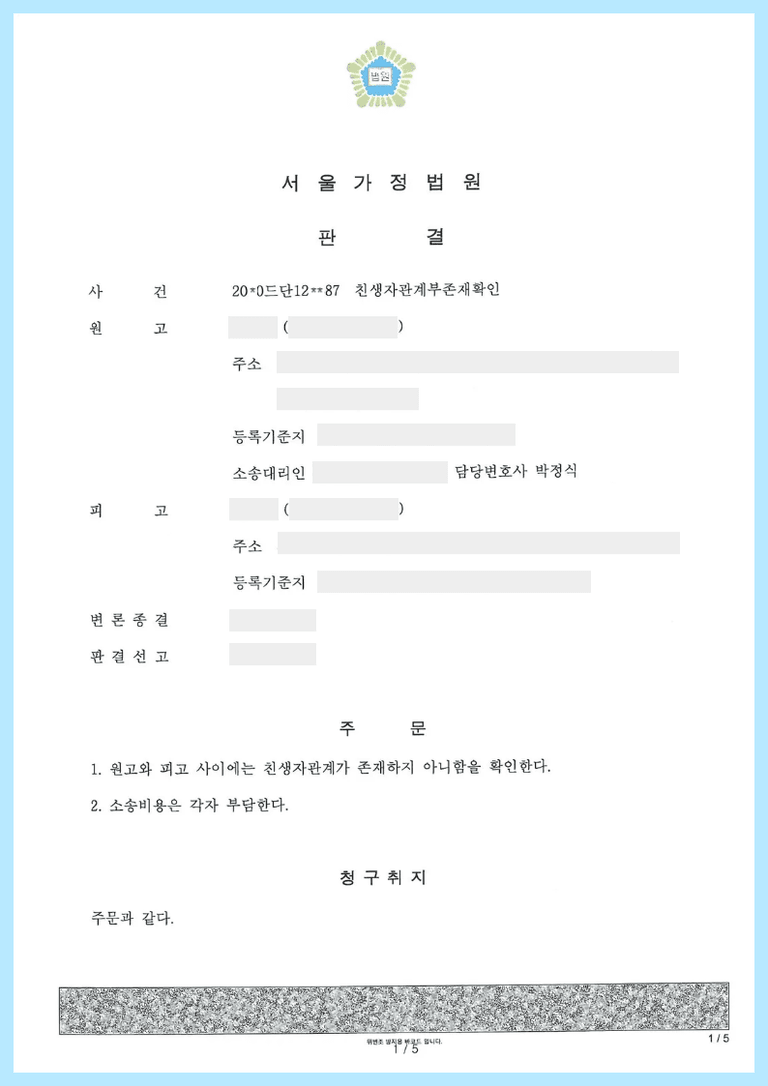 원고(처)가 남편과 혼인한 이후 남편이 다른 여자와의 사이에서 출생한 자녀를 마치 원고와 남편사이의 친생자인것처럼 친생자로 출생신고를 하였습니다. 이후 남편이 사망한 이후 원고는 피고가 가족관계등록부에 원고의 친생자로 등재되어 있지만 피고가 원고의 친생자가 아님을 확인하기 위하여 피고를 상대로 친생자관계부존재확인청구를 한 사안입니다. 원고의 자녀에서 피고를 제외하려는 소송에 대하여 피고는 동의하지 않고 거부하면서 다투었습니다.