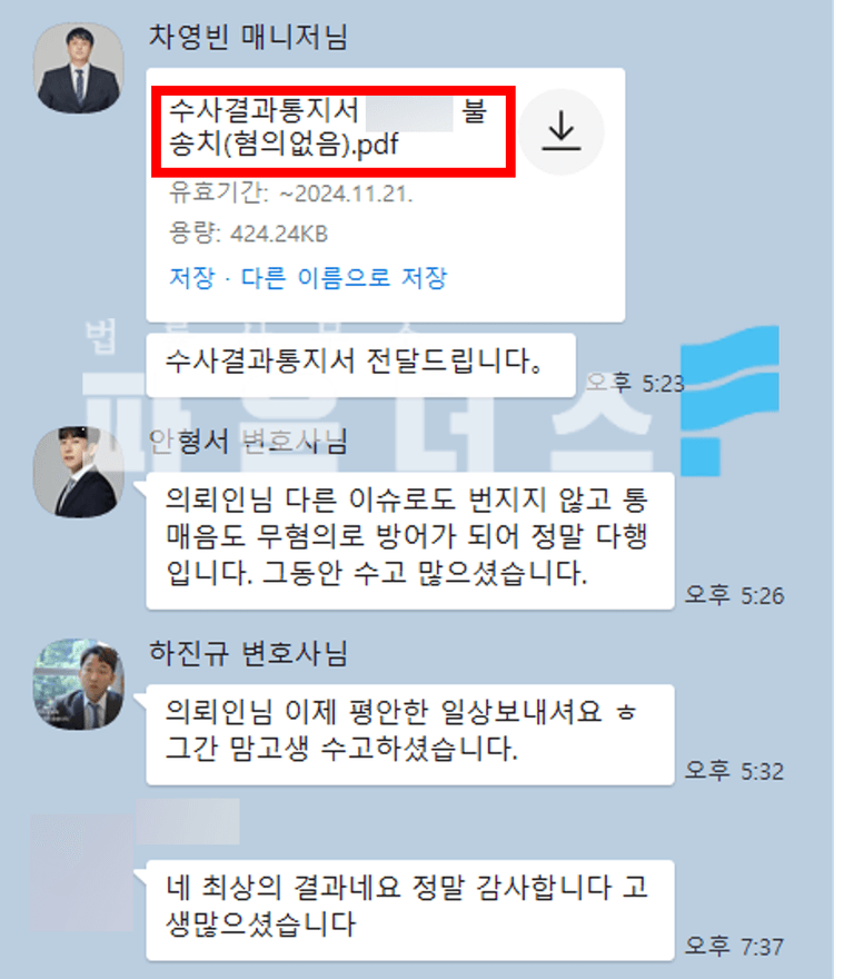 그 결과 의뢰인은 상대 여성에게 “만나서 밥 먹고 떡치자고.. 너 맛있어서 하자는거지”라 전송한 카톡 통매음 사건에 있어 불송치 결정(혐의없음)의 결과로 경찰 단계에서 사건을 마무리 지을 수 있었습니다.