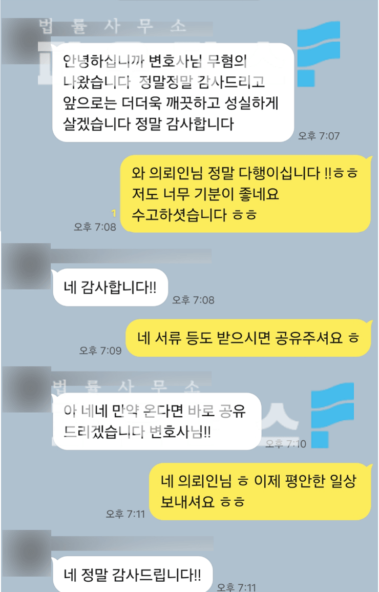 조사를 마친 이후 담당 검사와의 면담을 통해 의뢰인이 B 씨에 대한 답답한 마음에 우발적으로 한 발언일 뿐 성적인 목적이 없었음을 적극적으로 변론하였고 이 같은 내용을 변호인 의견서에 기재하여 제출하며 끝까지 성실한 조력활동을 하였습니다.