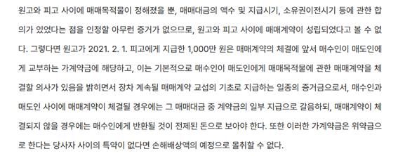 다만, 위 판례에서 보듯이, 이는 매매목적물만 정했을 뿐 그 매매대금이나 대금의 지급시기 등 계약의 주요사항들을 정하지 않은 채, 매매계약을 체결할 의사가 있음을 밝히면서 장차 계속될 매매계약 교섭의 기초로 가계약금을 지급한 것과 같이 ‘가계약’인 상태일 것을 요합니다.