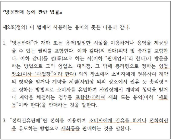 위와 같은 사례는 『방문판매 등에 관한 법률』에서 정하는 ‘전화권유판매’에 해당할 수 있기 때문입니다.