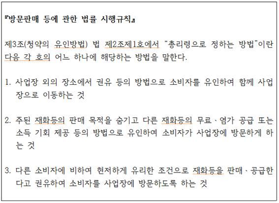 한 편, 위와 같은 ‘방문판매’ 또는 ‘전화권유판매’에 의하여 체결된 계약은 계약서를 작성한 날부터 14일 내에 계약을 철회할 수 있도록 규정하고 있습니다. (방문판매법 제8조)