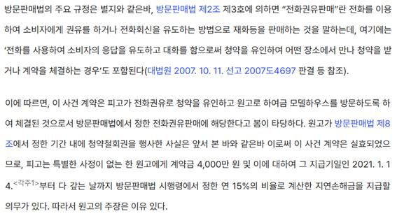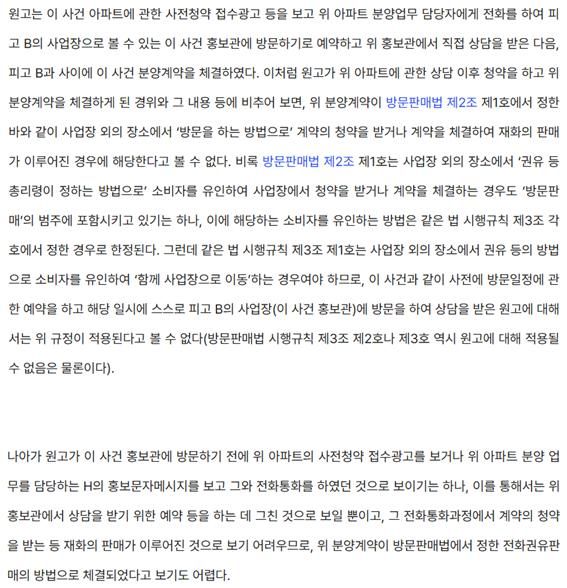 아래에서 ‘방문판매’ 또는 ‘전화권유판매’에 해당되어 청약 철회가 가능하다고 본 판례와, 이에 해당되지 않아 철회가 불가하다고 본 판례를 같이 소개하는 것으로 글을 마치겠습니다.