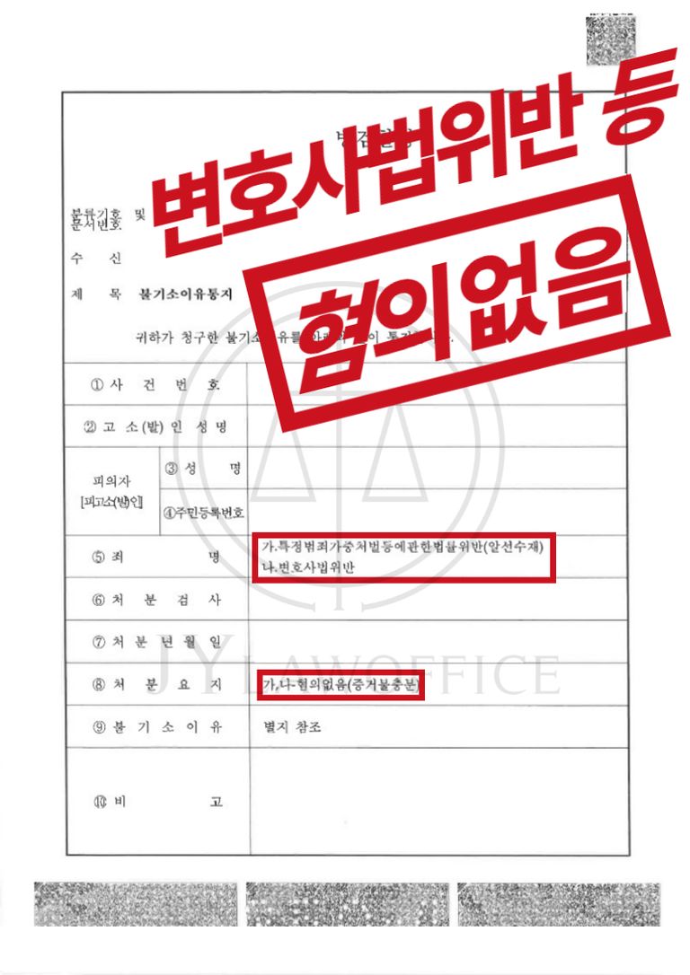 이와 같은 변호인의 조력에 따라, 의뢰인은 수사기관으로부터 혐의없음 처분을 받고 사건을 무사히 종결시킬 수 있었습니다.