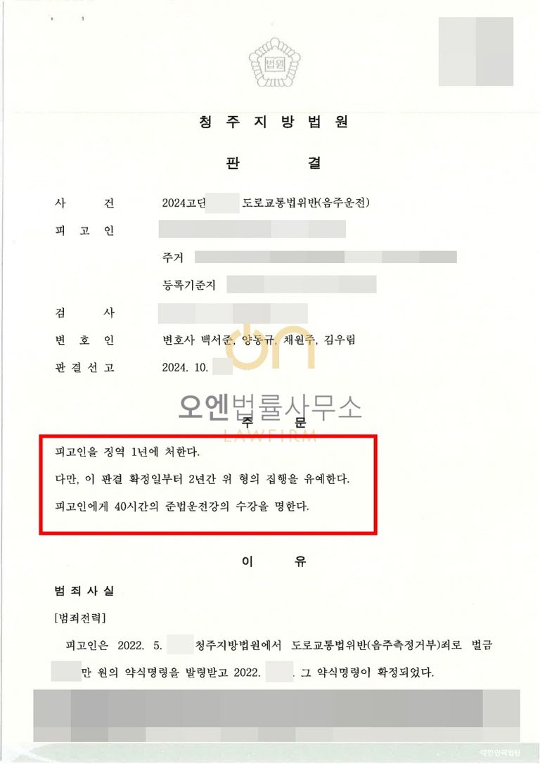담당변호사는 의뢰인이 이미 동종 전과가 있었고 높은 혈중알코올농도 수치가 나왔기 때문에, 최대한 실형을 피하기 위한 변론 전략을 세우고 의견서를 통해 대리운전을 호출한 이력이 있는 점, 성실하게 음식점을 운영하는 점 등 의뢰인에게 유리한 여러 정상관계 및 양형사유를 주장하여 재판부에 선처를 구하였습니다.