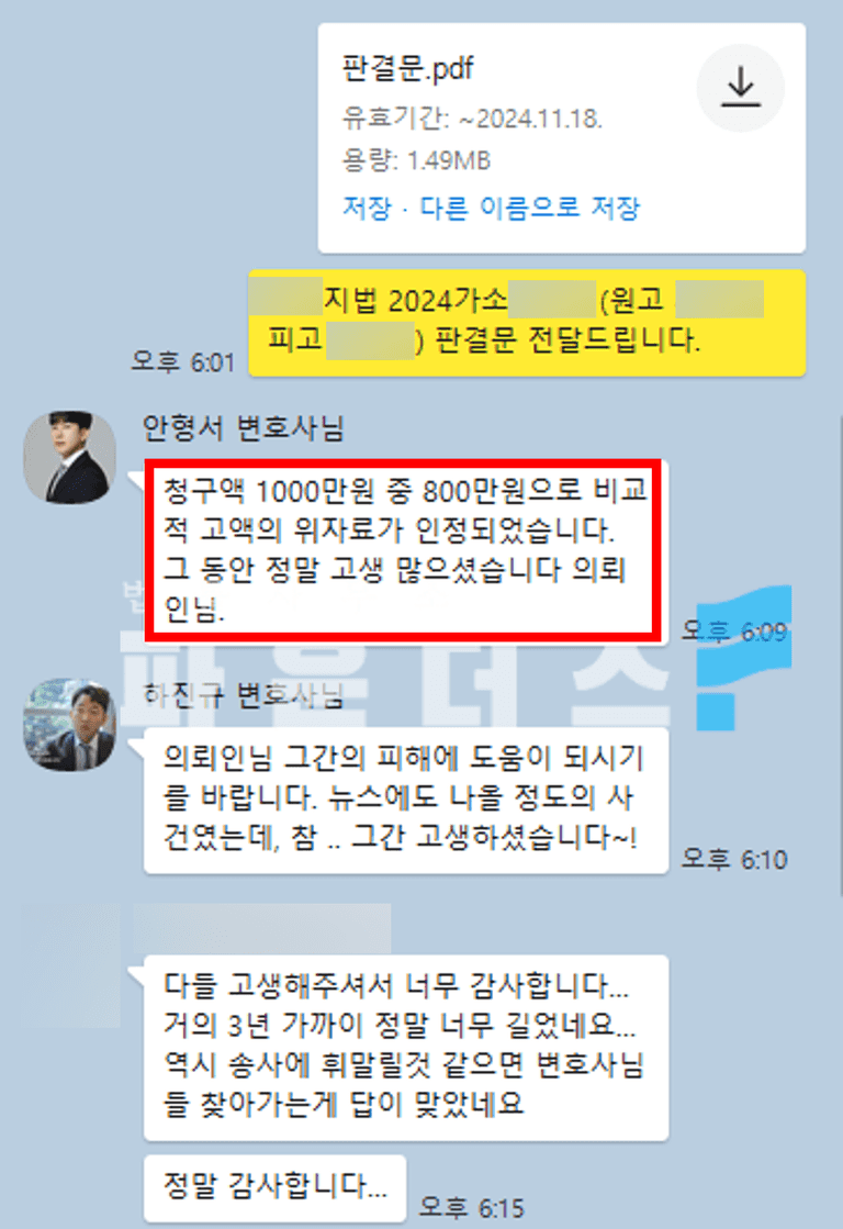 재판부는 변호인의 변론 취지를 받아들여 K 씨의 불법 행위를 인정하여 800만원의 금액을 지급하라는 판결을 내려 원고 승소의 결과로 사건을 마무리 지을 수 있었습니다.
