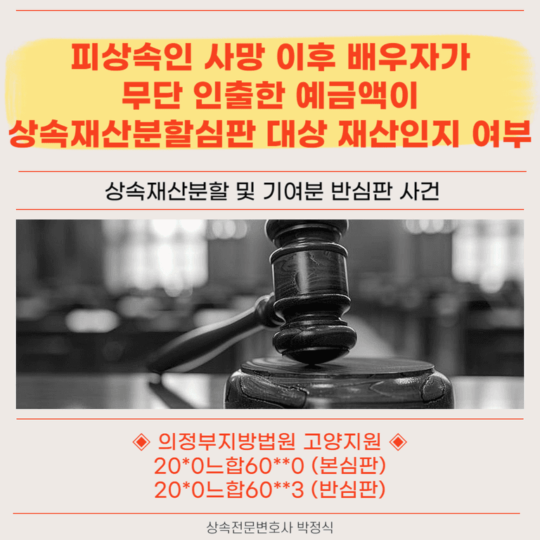 ② 피상속인 사망 이후에 배우자가 무단으로 인출하여 가져간 예금 채권은 민사소송으로 부당이득금반환청구를 할 수 있지만 이를 피상속인의 상속재산으로 보고 상속재산분할심판으로 반환청구를 할 수 있는 것은 아니라고 판단하여 이러한 금액반환청구는 인정하지 않았습니다.