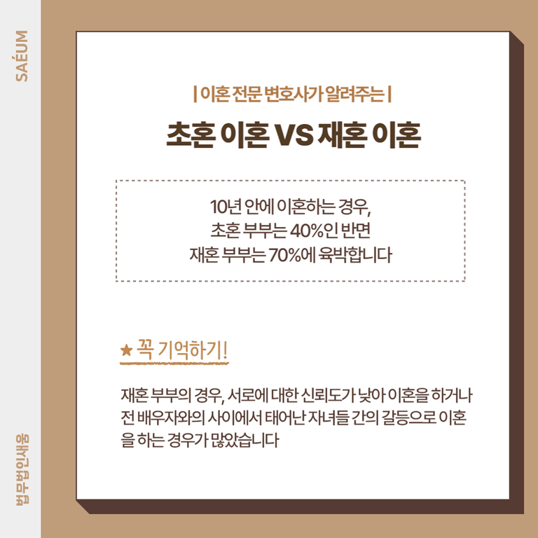 간혹 어떤 분들은 두 번이나 결혼에 실패하였다는 생각에 빠르게 정리하고 싶은 마음에 위자료 청구 없이 가지고 온 자산만 나누어 갖는 것으로 마무리하려고 하시는데요. 두고두고 후회로 남을 수 있으니 주의해야 합니다.