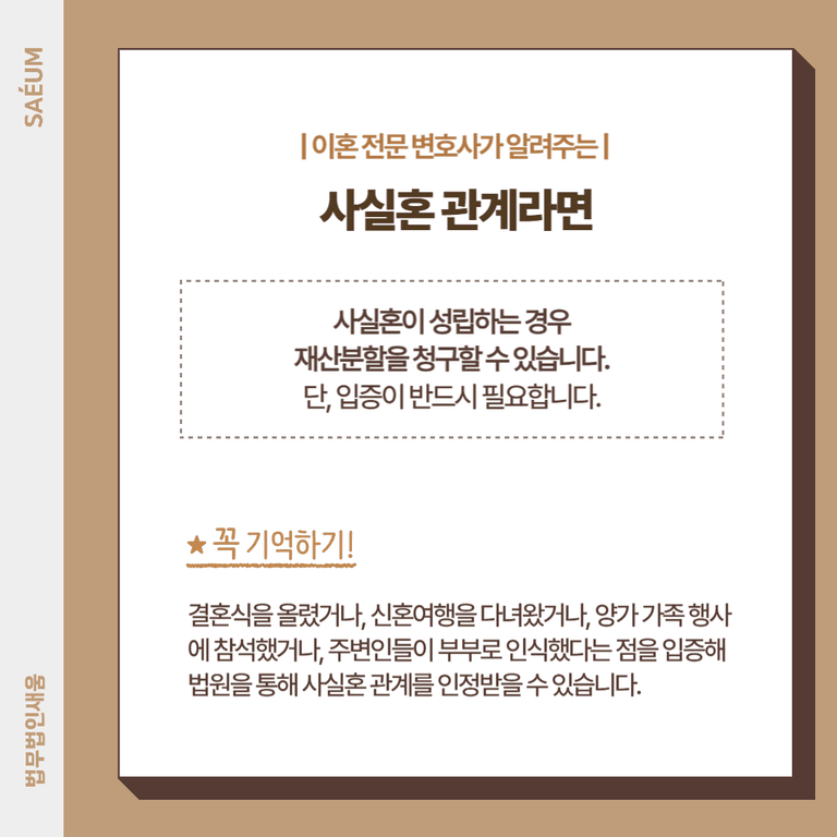 간혹 어떤 분들은 두 번째 결혼에서는 혼인신고를 하지 않은 채 함께 살았는데 분할을 요구할 수 있는지 질문을 하십니다. 원칙적으로 우리나라는 법률혼주의의 국가이기 때문에 법적으로 부부관계임이 증명되지 않는다면 재산에 대해 권리를 주장할 수 없습니다.