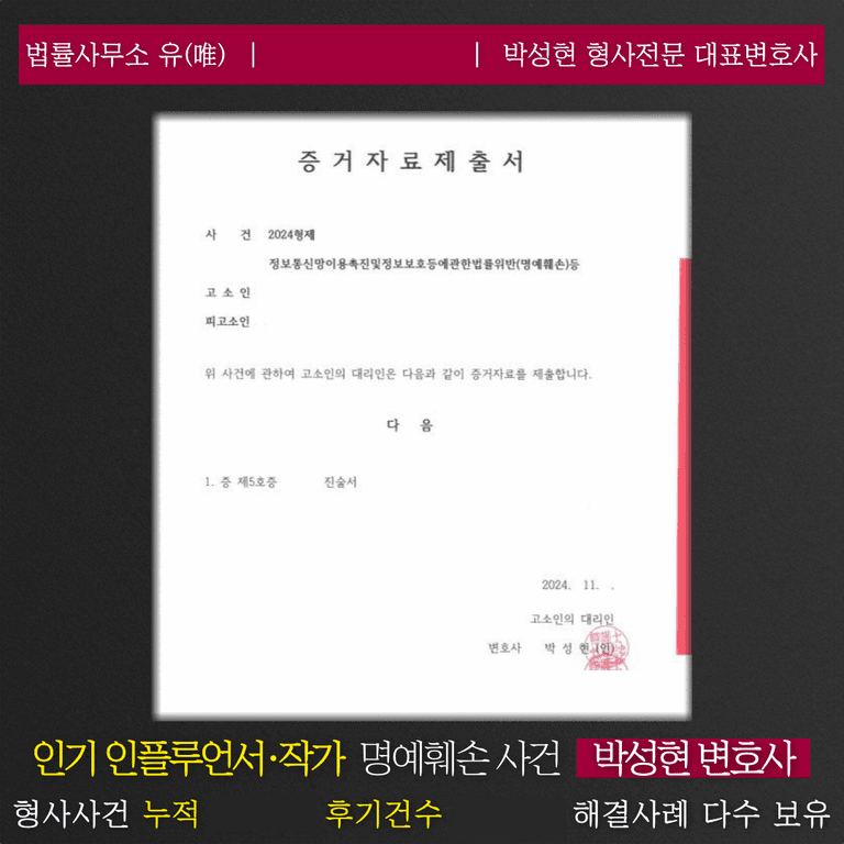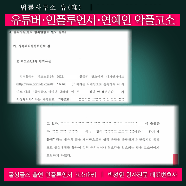 저, 법률사무소 유(唯) 박성현 형사전문 대표변호사는 100만 구독자 이상의 유튜버와 돌싱글즈 출연자의 악플고소 등 인플루언서나 유튜버, 유명인의 사이버 명예훼손 및 스토킹 사건을 통해 실무 경험을 보유하고 있는 만큼 고통받고 있는 상황이라면 전문가의 도움을 받아가며 적극적인 법적 대응을 권유하는 바입니다.