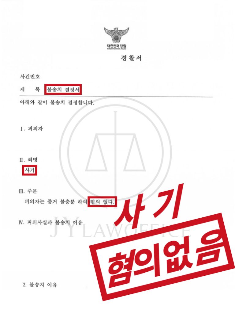 변호인의 조력으로 의뢰인은 혐의없음의 불송치 처분을 받고 무사히 사건을 종결시킬 수 있었습니다.