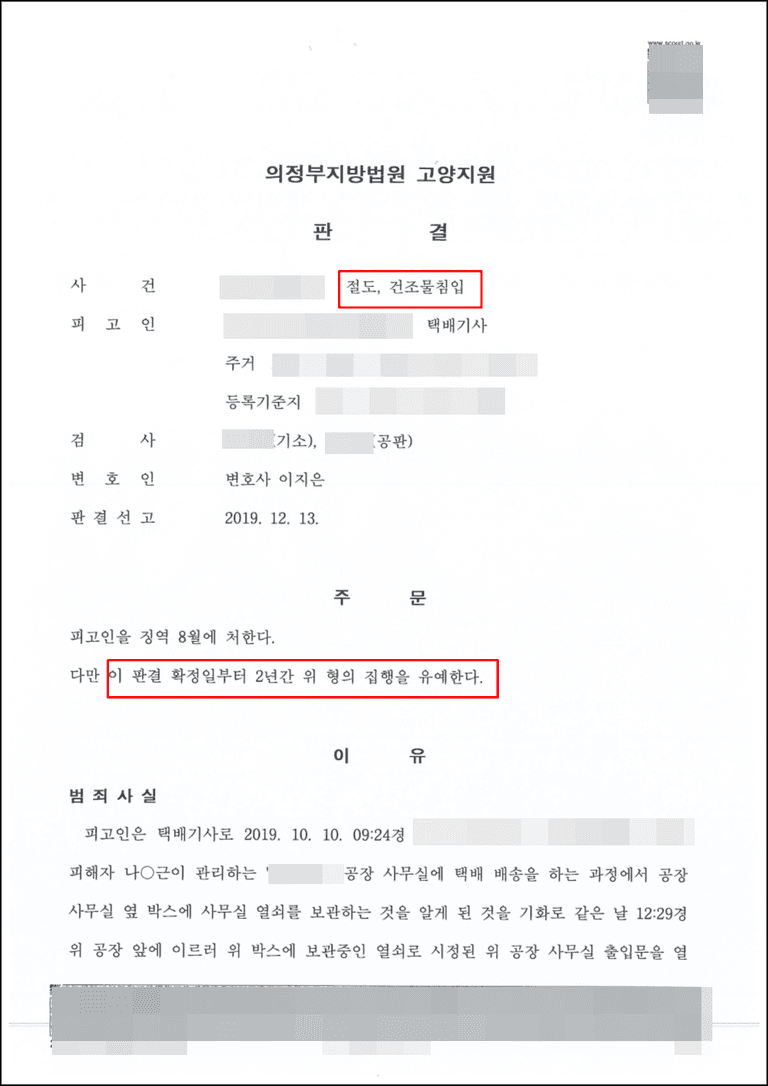 특히 본 사건 처럼 절도죄 하나만 성립하는 사안이 아닌, 건조물 침입죄 등도 함께 성립하는 수죄가 경합하는 경우 형사법 전문 변호사의 조력은 선택이 아닌 필수입니다.