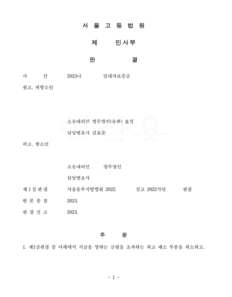 저는 즉각 임차보증금반환청구소송을 제기하여 계약 체결 경위, 보증금 지급주체, 피고의 행태 등을 볼 때 의뢰인이 임차인이 맞다고 주장하였고 법원은 저희의 주장을 받아들여 원고 승소 판결을 선고하여 의뢰인은 보증금을 반환받았습니다.