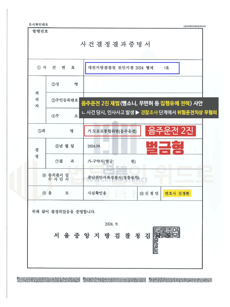 그 결과, 음주운전 재범 사안에 대하여도 벌금형 구약식 처분으로 본 사건은 종결되었습니다.