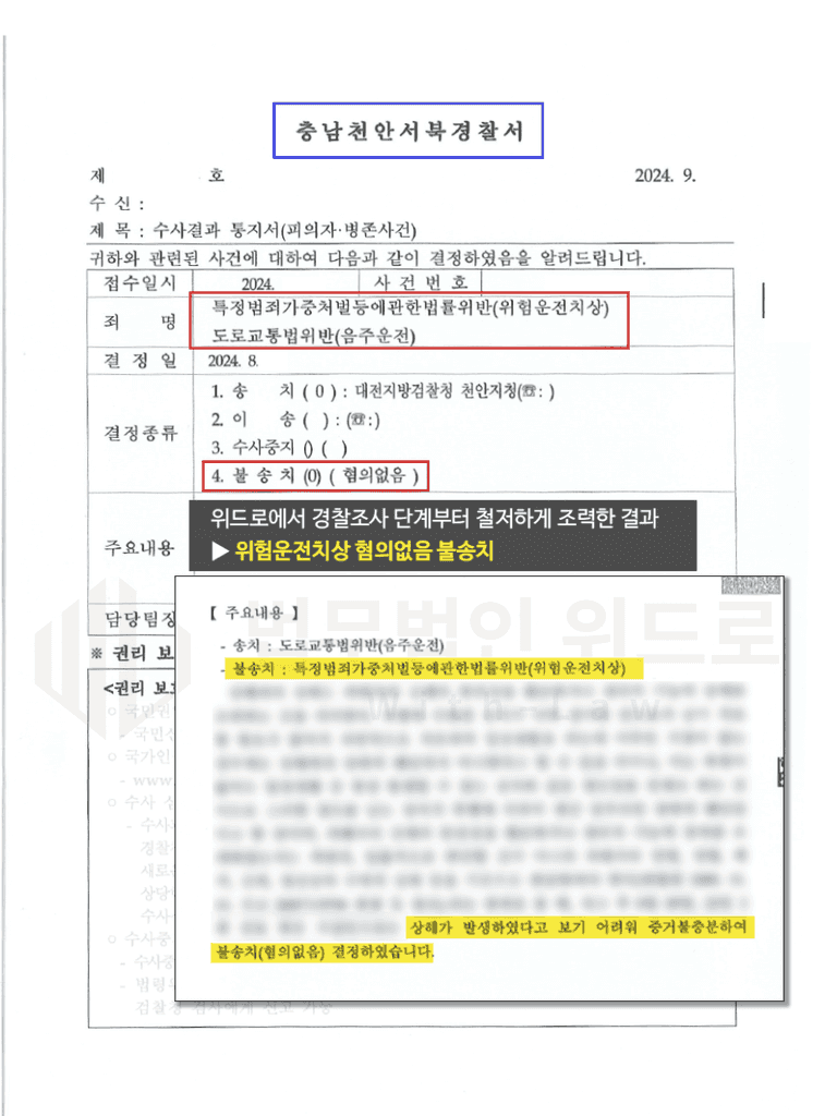 경찰단계부터 철저하게 사건을 조력한 결과, 위험운전치상 사안은 혐의없음 불송치 처분이 되었고 음주운전 사안만 검찰에 송치되었는데요.