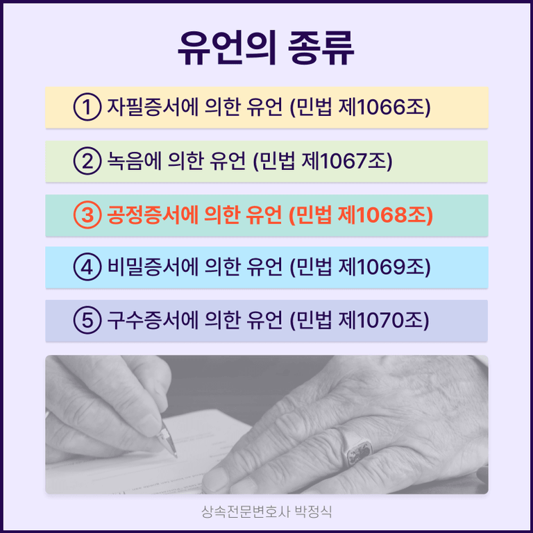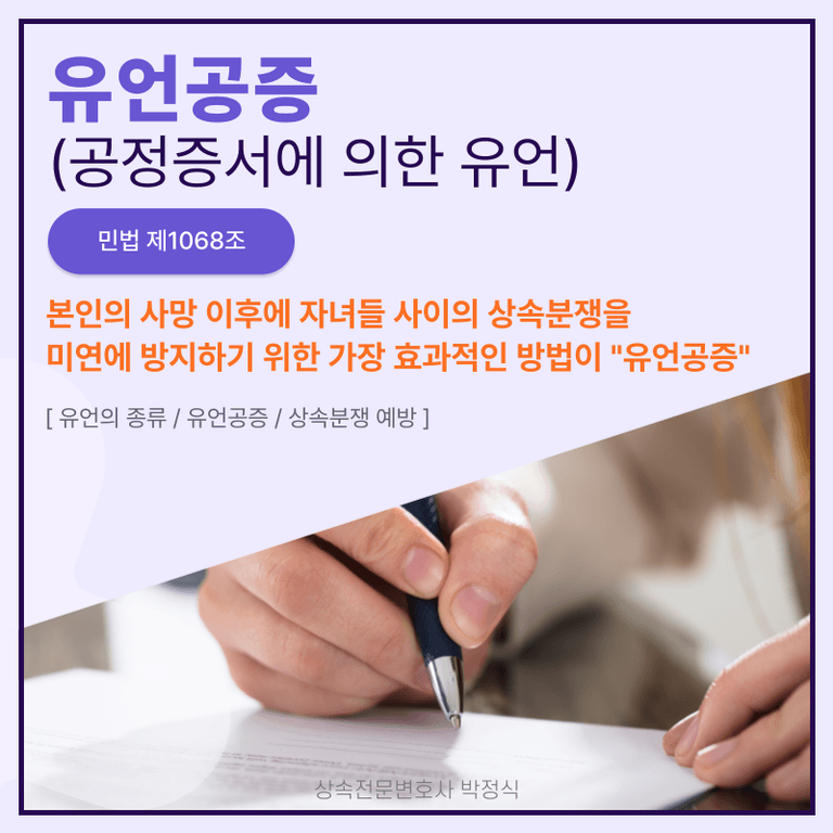 또한 요즘에 많은 분들이 자주 문의하고 있는 ‘유언공증’이라는 방법이 있는데, 이 유언공증이 바로 민법 제1068조로 규정하고 있는 ‘공정증서에 의한 유언’을 말합니다.
